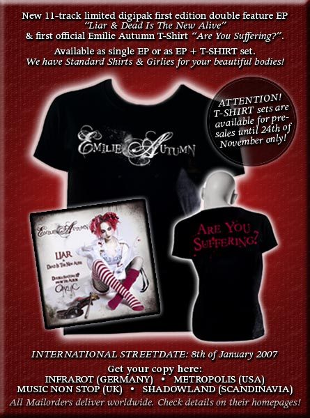 - On October 31, 2006, Emilie announced the upcoming release of the Liar/Dead Is The New Alive EP, mostly containing remixes of the two songs. She released it as a set with the first official Emilie Autumn tee (pictured below). The text "Are You Suffering?" on the shirt is from her song "Liar."